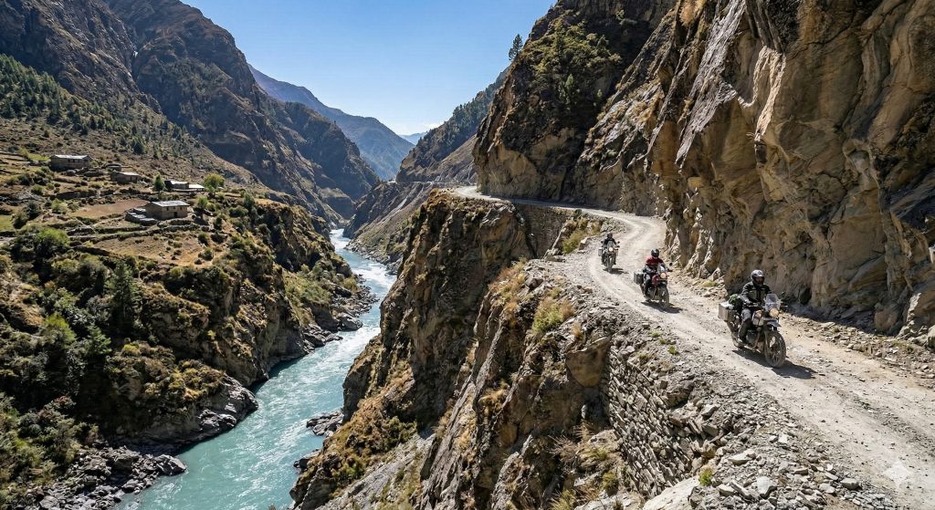 You’ll transition from the lush pine forests of Almora to the sheer cliff-side “vertical” roads of Dharchula, eventually hitting the high-altitude desert and rocky trails of the Vyas Valley. Riding alongside the Kali River, which serves as the international border between India and Nepal. You’ll see Nepali villages just a stone’s throw away across the gorge